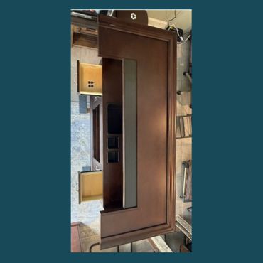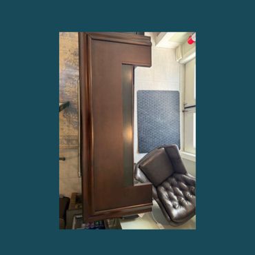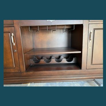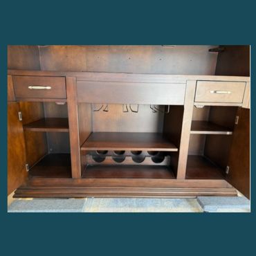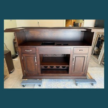 Custom solid wood construction with a finished front and back, architectural bar top with overhang, integrated foot rail, drawers, shelving, hanging stemware storage, bottle storage, and two locking liquor cabinets. Two complete sets of keys are included to keep staff and children out.