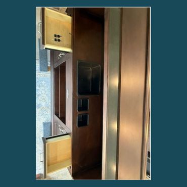There are two locking liquor cabinets, each measuring 24 inches high by 12 inches wide, with full-height shelving at 24 inches. Two full sets of keys are included.